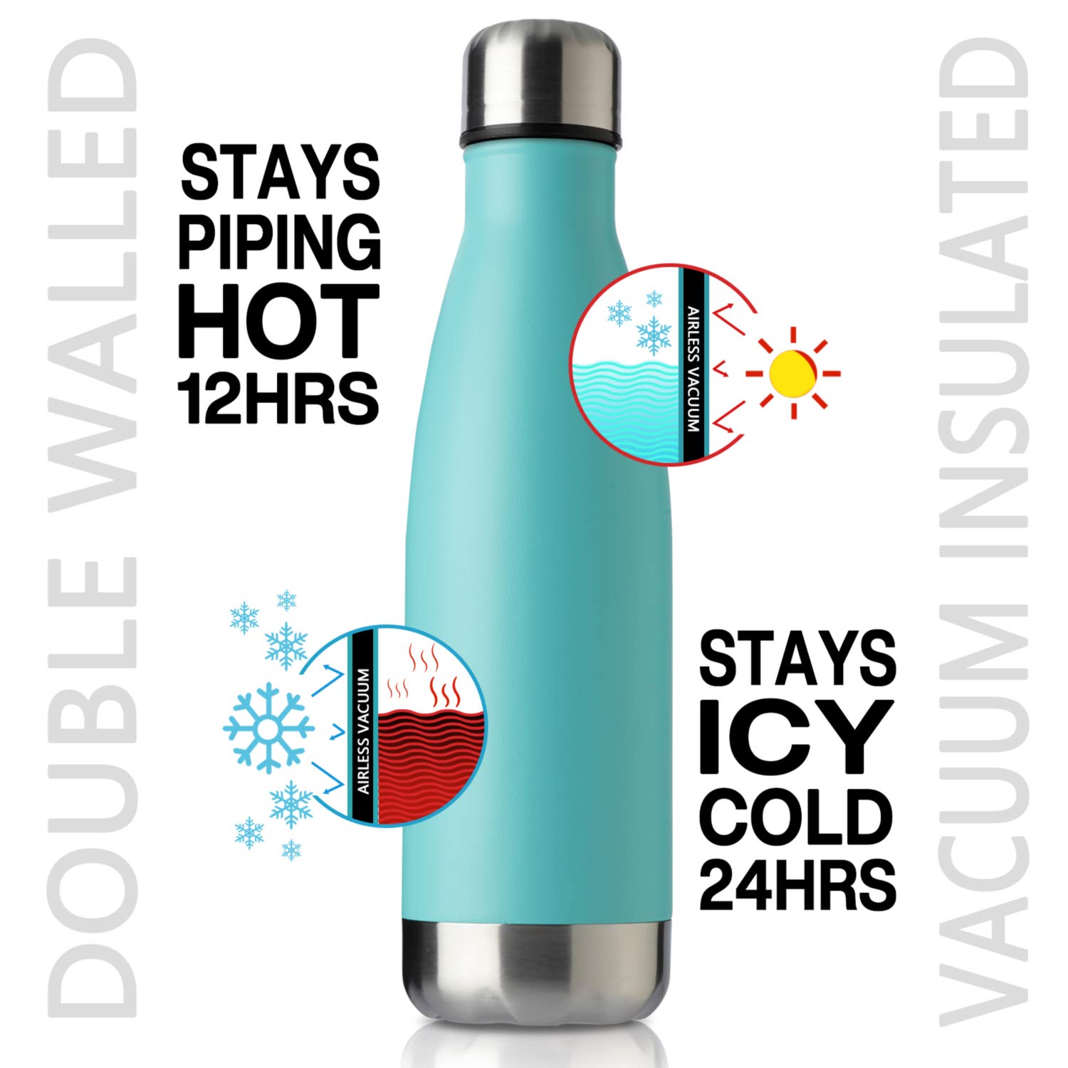 - ขวดน้ำเป็นกำแพงสองชั้นและฉนวนสูญญากาศซึ่งช่วยให้เครื่องดื่มที่คุณชื่นชอบร้อนหรือเย็นเป็นเวลาหลายชั่วโมง
