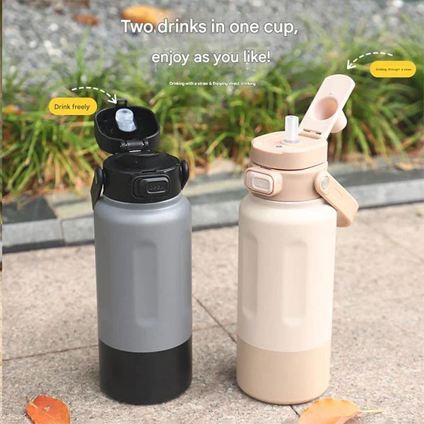 ขวดสปอร์ตสเตนเลสสตีลพร้อมที่จับมีฝาปิดพวยและฝาปิดด้ามจับเพื่อให้แน่ใจว่ามีการซีลกันรั่ว ฝาปิดทั้งสองมีที่จับเพื่อให้พกพาสะดวก