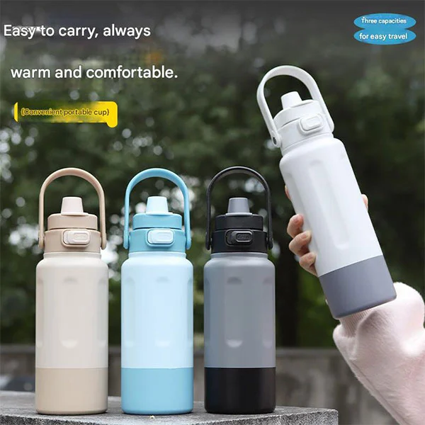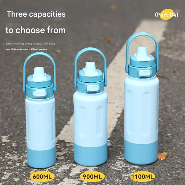ขวดกีฬาสเตนเลสสตีลพร้อมที่จับขนาด 600 มล./900 มล./1000 มล. นี้โดดเด่นด้วยการออกแบบฉนวนสุญญากาศผนัง 2 ชั้น ช่วยให้เครื่องดื่มร้อนได้ 12 ชั่วโมงและเย็นได้ 24 ชั่วโมง